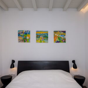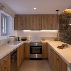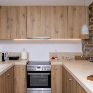 The interiors are bright and thoughtfully arranged, featuring an open-plan living area, a fully equipped kitchen, and two comfortable bedrooms. The layout ensures both privacy and functionality, making it ideal for families or small groups seeking a refined, independent stay.