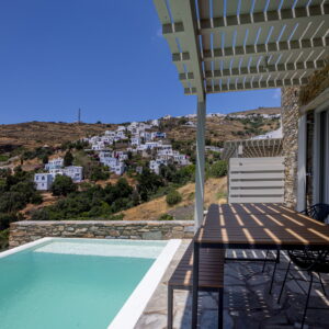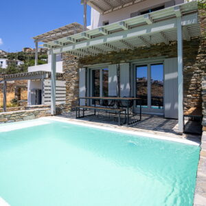 The terrace and private pool define the Villa Estia experience — a secluded outdoor setting for swimming, unwinding, and enjoying the ever-changing light from morning through sunset.